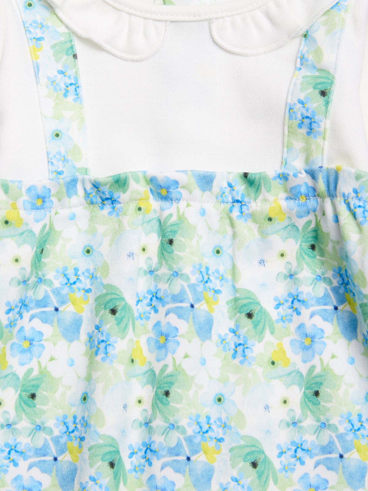 Tutina in caldo cotone stampato fantasia floreale, particolari in unito. Taglio davanti arricciato e girocollo con rouches aggiunge un tocco femminile. Apertura dietro ed entrogamba con bottoni a pressione. Una tutina pratica e carina per la vostra neonata.