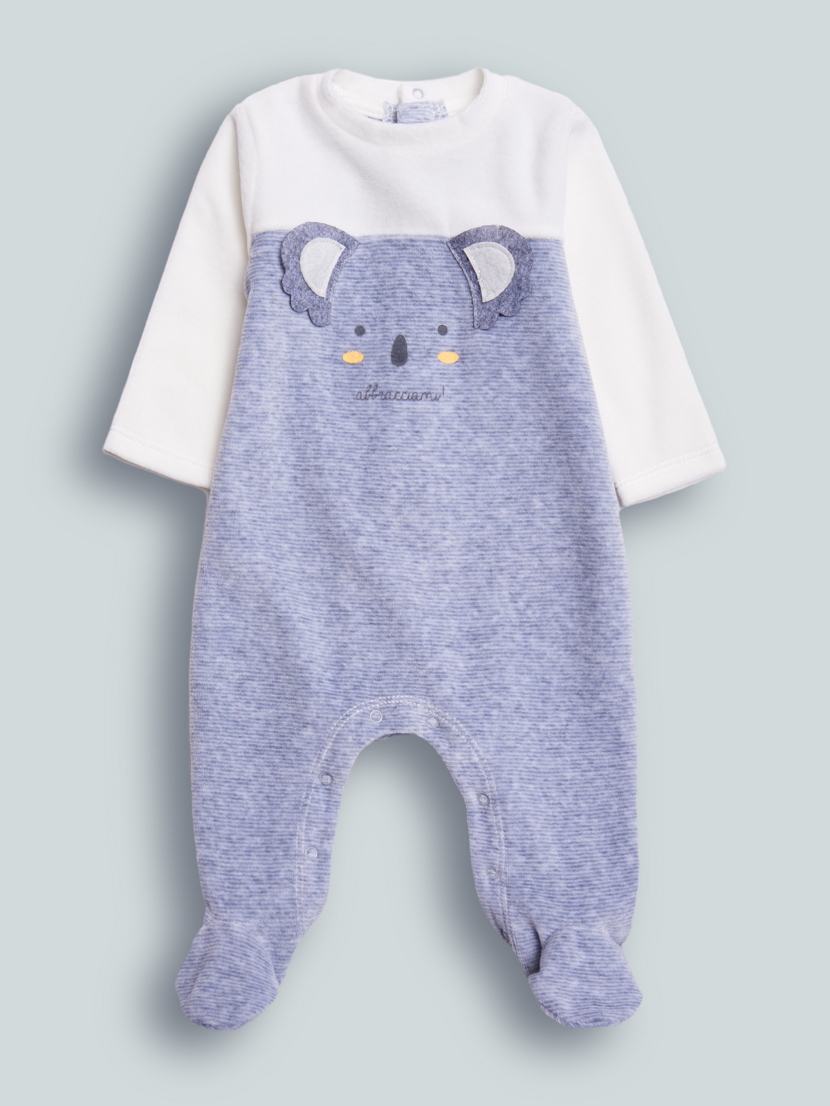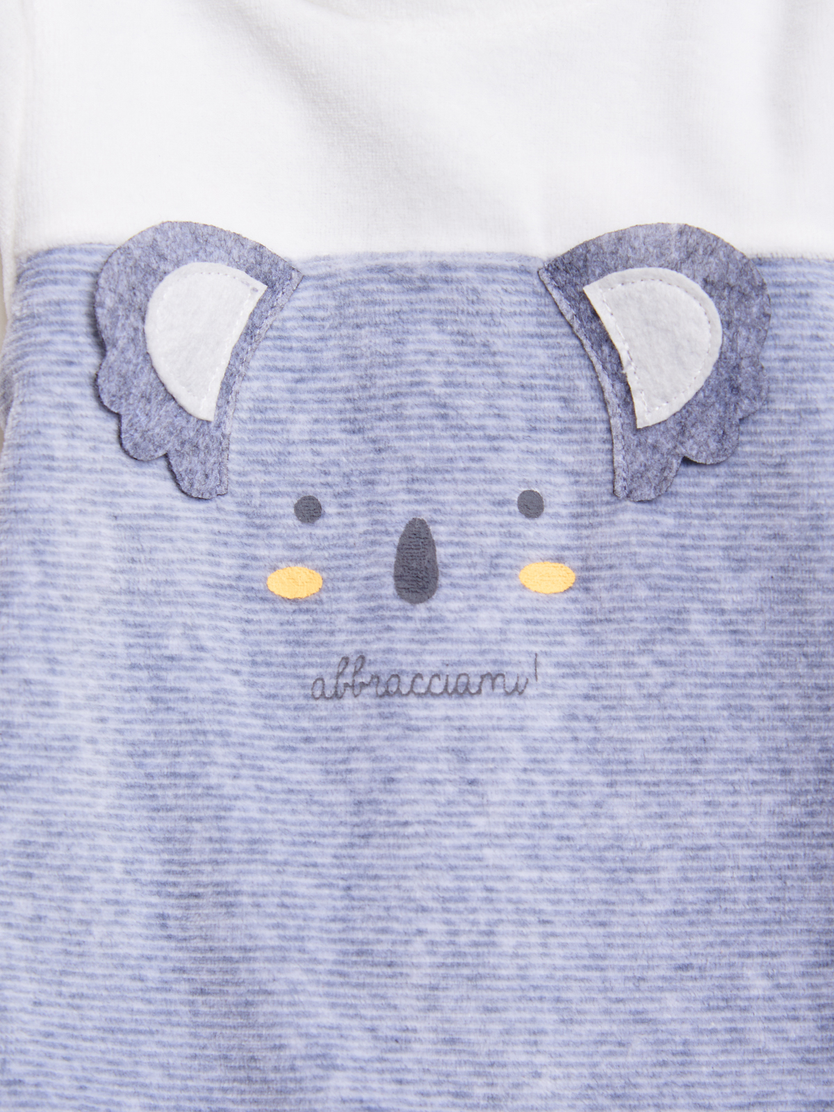 Tutina in Morbida ciniglia rigato tinto filo con inserti in unito. Taglio davanti con simpatiche orecchie 3D e stampa Musetto. Pratica apertura dietro ed entrogamba con bottoni a pressione. Capo simpatico che farà divertire il vostro neonato.