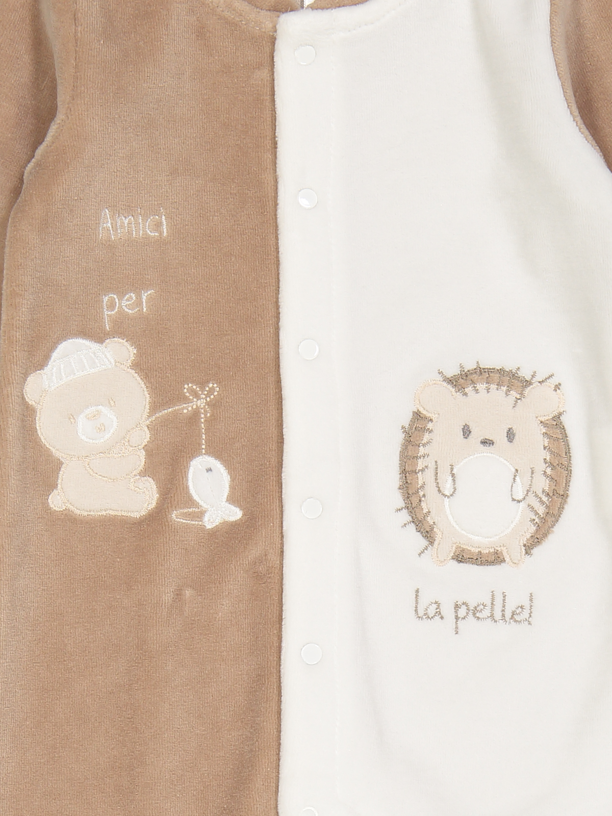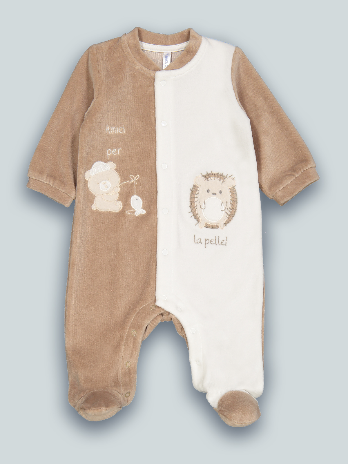Tutina in morbida ciniglia bicolore, apertura davanti ed entrogamba con bottoni a pressione. Simpatici animaletti ricamati. Questo articolo fa parte del corredino composto da tutti gli articoli indispensabili per il tuo neonato.