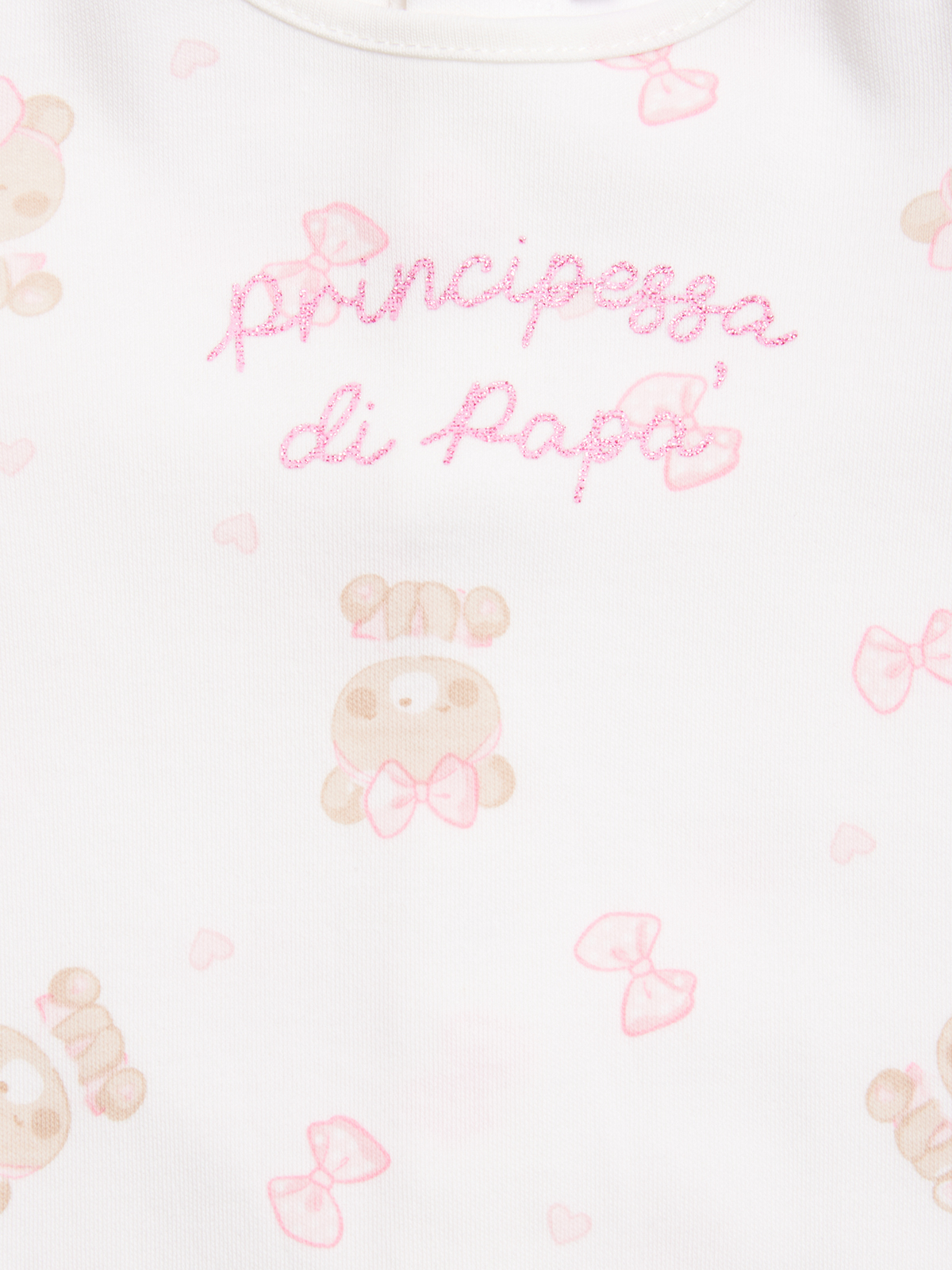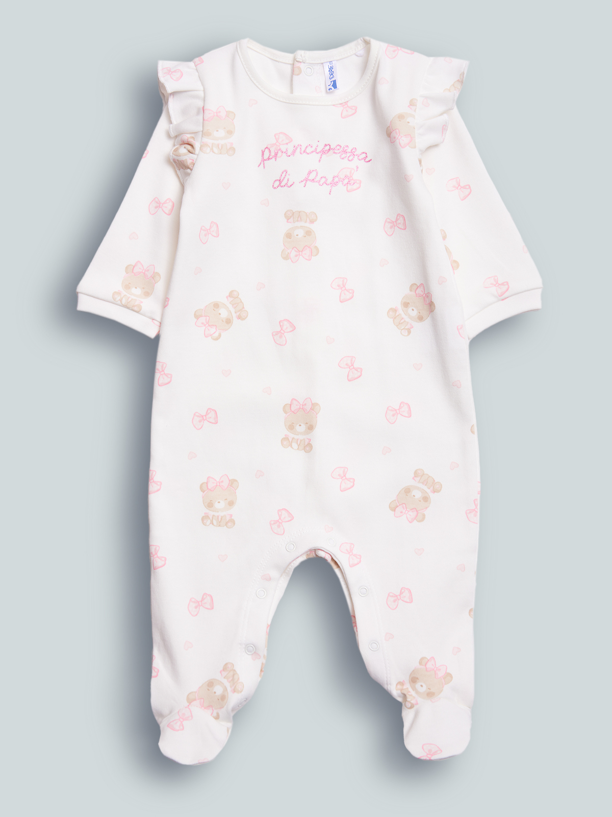 Tutina in caldo cotone stampato fantasia, Manica lunga, apertura dietro ed entrogamba con bottoni a pressione per agevolarne l’indosso. Tenera stampa glitter davanti. Un capo funzionale ed alla Moda, che non può Mancare nell’armadio delle vostre neonate.